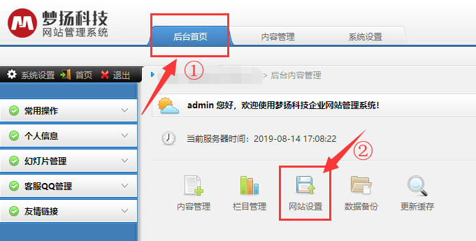 说明:依次点击图1【后台首页】【网站设置】即可进入网站设置界面操作,如图2,此处可设置网站的SEO基本信息(标题、关键词、描述)。