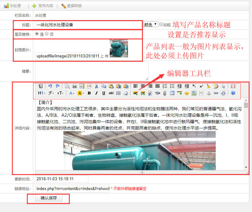 说明:填写【标题】【设置是否推荐(一般为推荐到网站首页显示)】【上传封面图片(产品列表一般为图片列表显示,此处必须上传图片)】【详细内容】即可,完成后点击【确认保存】。(编辑器工具栏有每个工具图标对应的工具名称,鼠标悬停显示名称)