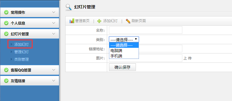 【添加幻灯】:点击【添加幻灯】链接出现上图界面,依次填写【名称】【类别:电脑端或手机端】【链接地址(可不填)】【上传图片(图片尺寸根据每个网站的不同,具体咨询我司工作人员)】,【确认保存】即可。