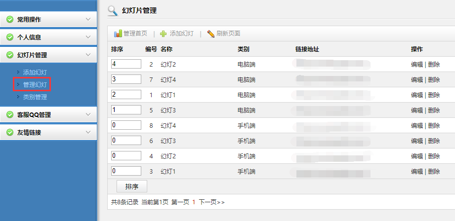 【管理幻灯】: 点击【管理幻灯】链接出现上图界面。