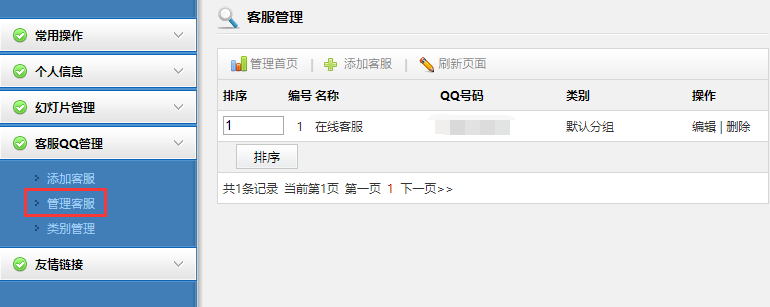 说明:进入后台首页或点击顶部导航【后台首页】,点击左侧边栏【客服QQ管理】。
