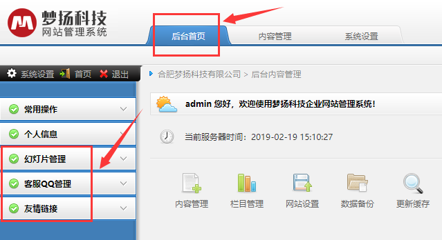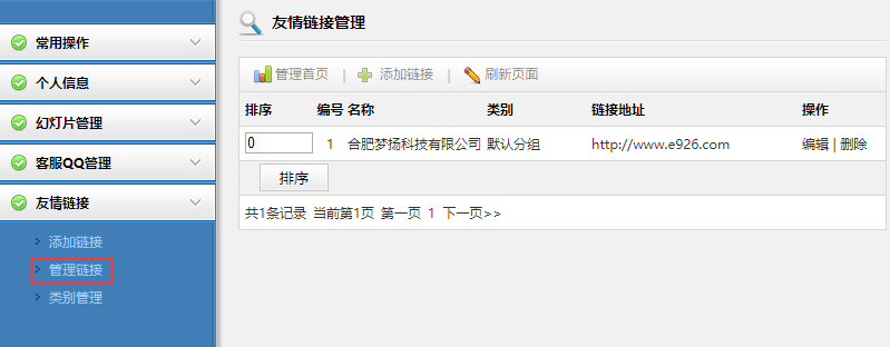 说明:进入后台首页或点击顶部导航【后台首页】,点击左侧边栏【友情链接】。