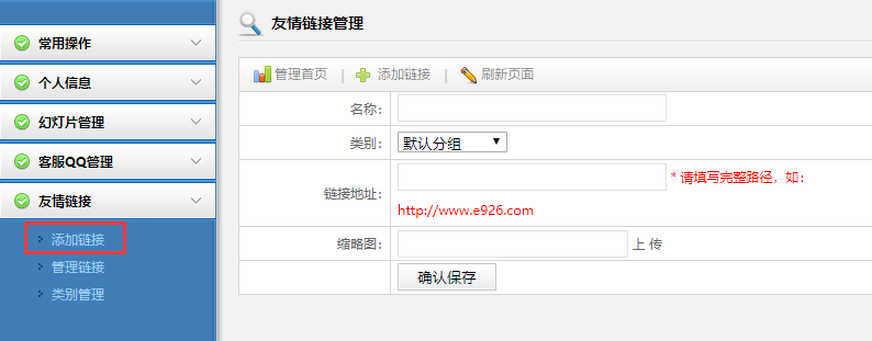 【添加链接】:点击【添加链接】链接出现上图界面,依次填写【名称】【类别】【链接地址】【缩略图(如是前台是文字链接则不用上传图片)】,【确认保存】即可。