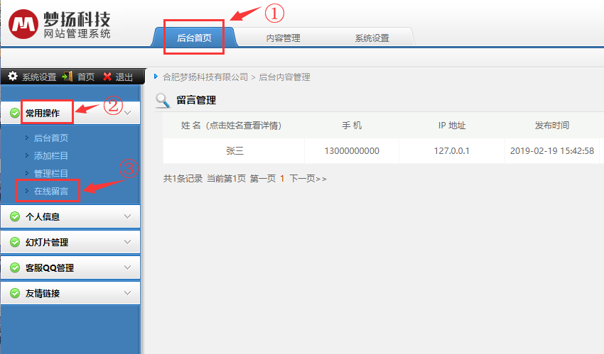 说明:进入后台首页或点击顶部导航【后台首页】,依次点击左侧边栏【常用操作】——【在线留言】,即可查看访客网站留言信息,如【姓名】【手机号】【IP地址】【留言时间】等。