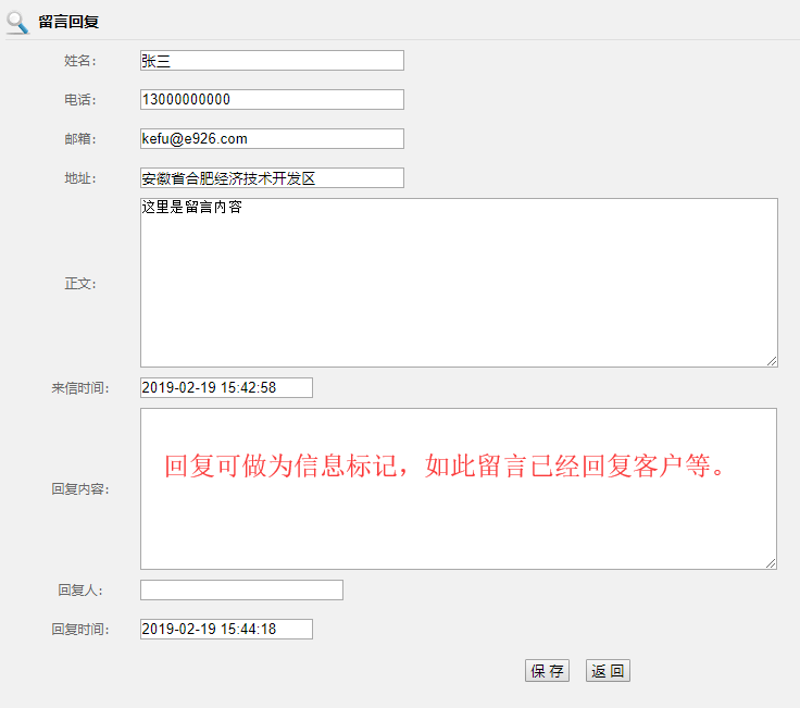 说明:查看访客留言具体信息【姓名】【电话】【邮箱】【地址】【留言内容】【留言时间】等信息,可进行线下沟通联系,并可回复标记此留言信息。
