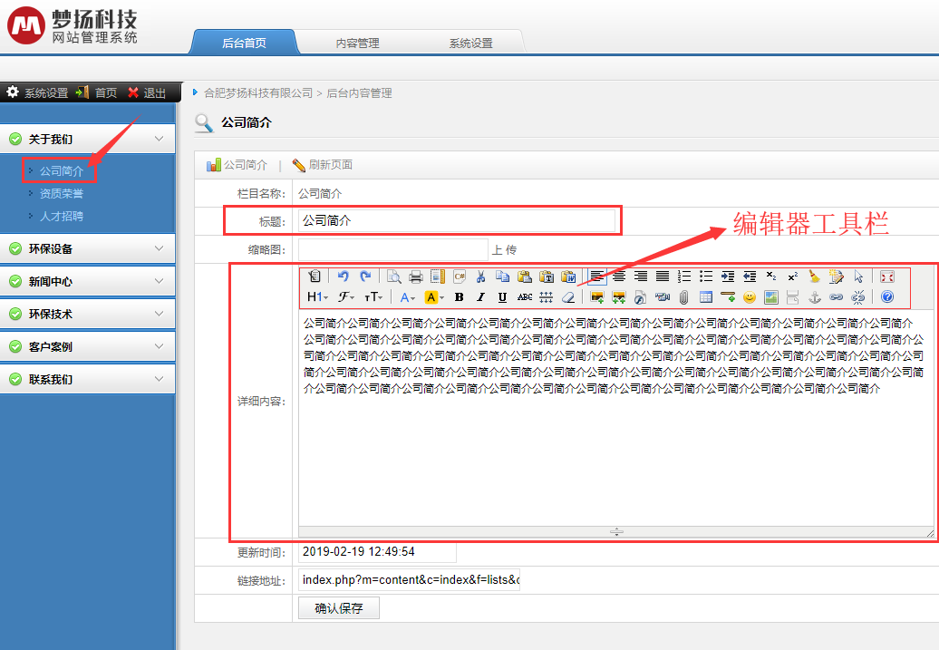 说明:填写【标题】和【详细内容】即可,完成后点击【确认保存】。(编辑器工具栏有每个工具图标对应的工具名称,鼠标悬停显示名称)