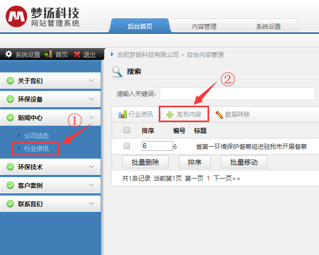 说明:点击左侧【新闻类别】栏目,打开文章列表,点击【发布内容】即可添加新文章。