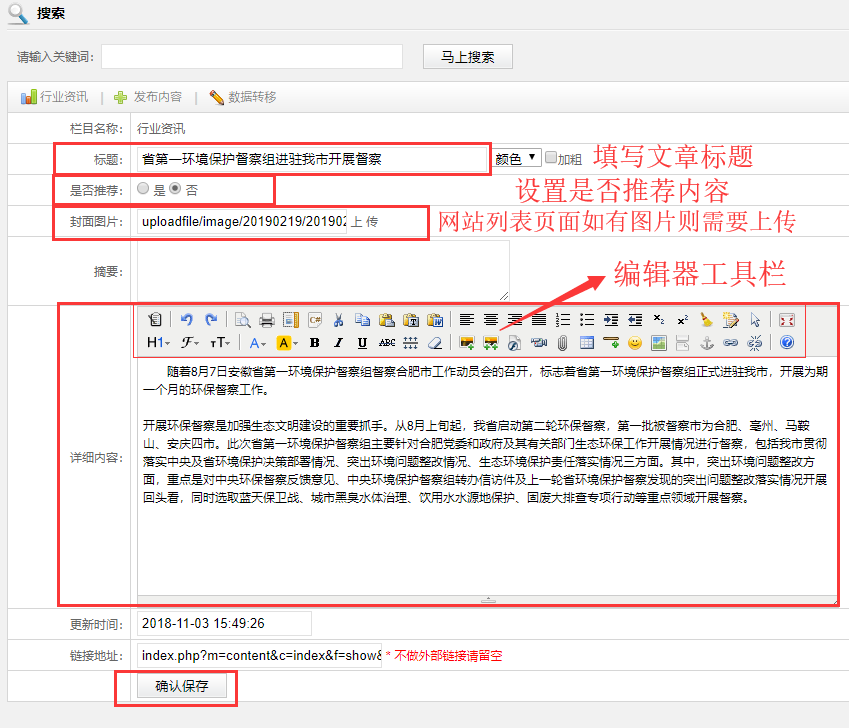 说明:填写【标题】【设置是否推荐(一般为推荐到网站首页显示)】【上传封面图片(根据前台网站显示情况选择是否上传,如是图文列表则需要上传图片,如只是文字列表则不需要上传图片)】【详细内容】即可,完成后点击【确认保存】。(编辑器工具栏有每个工具图标对应的工具名称,鼠标悬停显示名称)